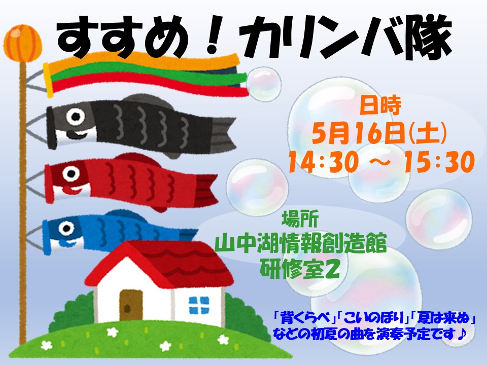 すすめ!カリンバ隊(5月) 2026年4月17日 イベント情報 日時 5月16日(土) 14:30 ~ 15:30場所 山中湖情報創造館 研修室2 初夏にぴったりの曲を演奏予定です。「背くらべ」「こいのぼり」「夏は来ぬ」を中心に1曲ものにしてお帰りいただけます! 当日のご来場お待ちしております! Share: Older Post 【再再掲】4月のおはなし会 Newer Post 【再掲】すすめ!カリンバ隊(4月)