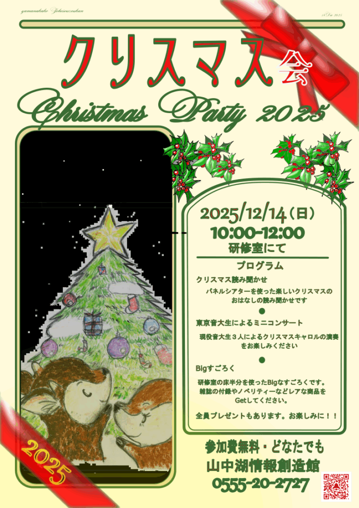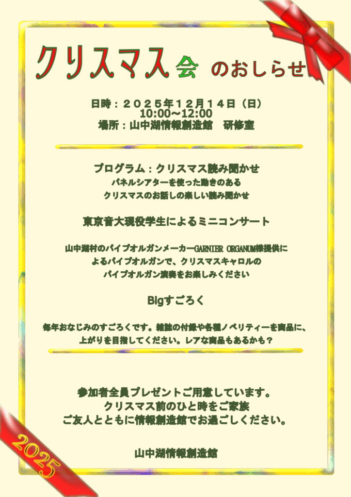 山中湖情報創造館では、今年も「クリスマス会」を開催します!