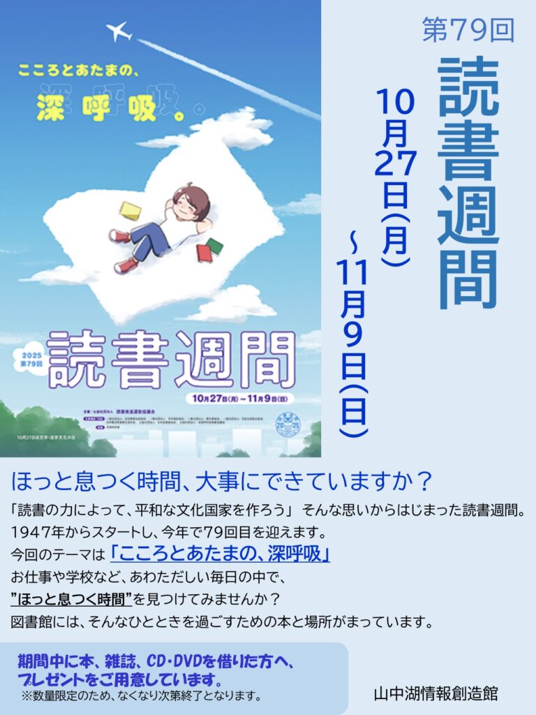 令和7年度読書週間 2025年10月27日 イベント情報 本日より、第79回読書週間がスタートしました。今回のテーマは「こころとあたまの、深呼吸」です。ぜひ図書館で、あなただけの”ほっと息つく時間”を見つけてみてください。期間 10月27日(月)~11月9日(日)期間中に本、雑誌、CD・DVDをお借りいただいた方へは、図書館からささやかなプレゼントをご用意しています。ご来館、お待ちしています! Share: Older Post 山中湖ブックリサイクル市2025 Newer Post 令和7年大人の選書ツアー