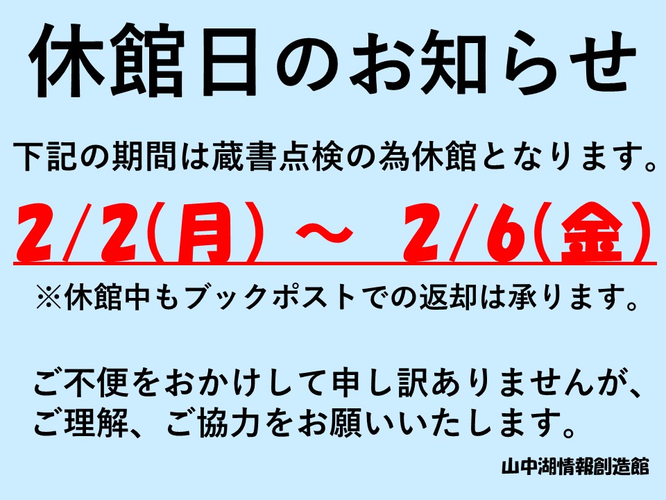 休館日のお知らせ 2026年1月16日 お知らせ 2/2(月)~2/6(金)は蔵書点検の為休館となります。※休館中もブックポストでの返却は承ります。 ご不便をおかけして申し訳ありませんが、ご理解、ご協力をお願いいたします。 Share: Older Post お年玉読書くじ終了のお知らせ Newer Post 除菌BOX設置のお知らせ