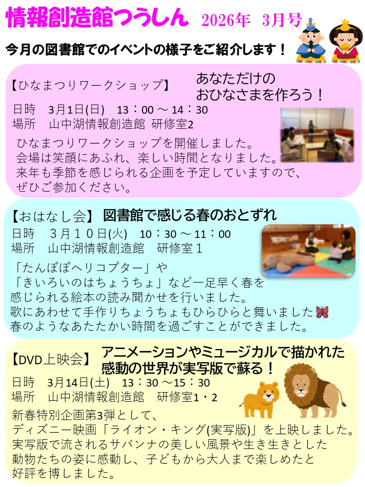 情報創造館つうしん<2026年3月号> 2026年3月30日 お知らせ 2026年3月の情報創造館でのイベントの様子を一部ご紹介します。今月もたくさんのご参加ありがとうございました! また、情報創造館つうしんは今月号で終了となります。今後は各イベントごとに様子を紹介していきますので、引き続き楽しみにお待ちください! Share: Older Post 4月の読書会