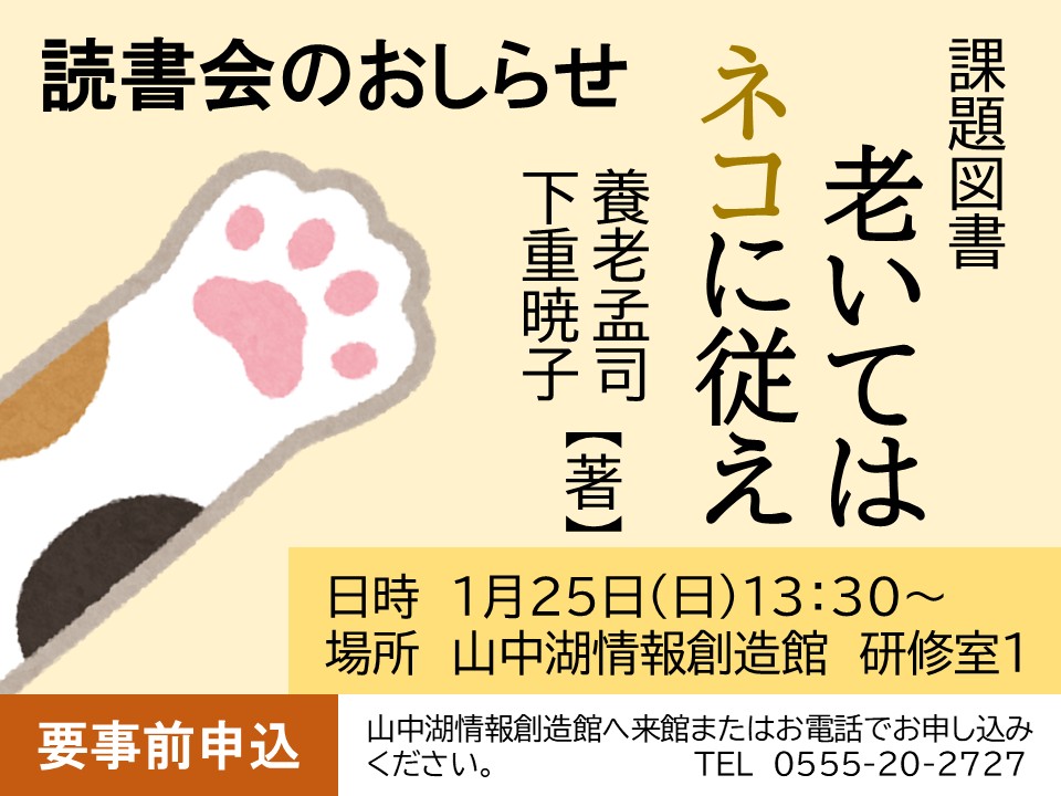 1月の読書会 2025年12月28日 イベント情報 日時 1月25日(日) 13:30~15:00場所 山中湖情報創造館 研修室1課題図書は…『老いてはネコに従え』(養老孟司、下重暁子/著)【要事前申し込み】となっています。参加希望の方は、山中湖情報創造館へ来館またはお電話でお申し込みください。 Share: Older Post すすめ!カリンバ隊(1月) Newer Post よいお年をお迎えください