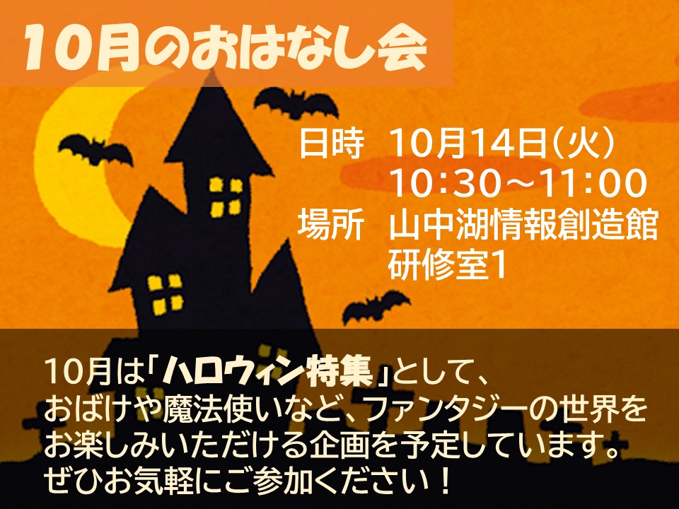10月のおはなし会 2025年10月3日 イベント情報 日時 10月14日(火) 10:30~11:00場所 山中湖情報創造館 研修室110月は”ハロウィン特集”として、おばけや魔法使いなど、ファンタジーの世界をお楽しみいただける企画を予定しています。申し込みは不要、どなたでもご参加いただけます。 ぜひお立ち寄りください! Share: Older Post 10月のイベントカレンダー Newer Post すすめ!カリンバ隊(10月)