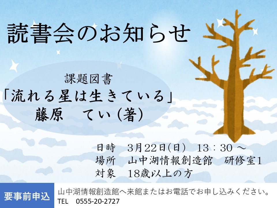 3月の読書会 2026年3月2日 イベント情報 日時 3月22日(日) 13:30~15:00場所 山中湖情報創造館 研修室1対象 18歳以上の方課題図書は『流れる星は生きている』(藤原てい/著)です。【要事前申し込み】となっています。参加希望の方は、山中湖情報創造館へ来館またはお電話でお申し込みください。 Share: Older Post 3月のイベントカレンダー