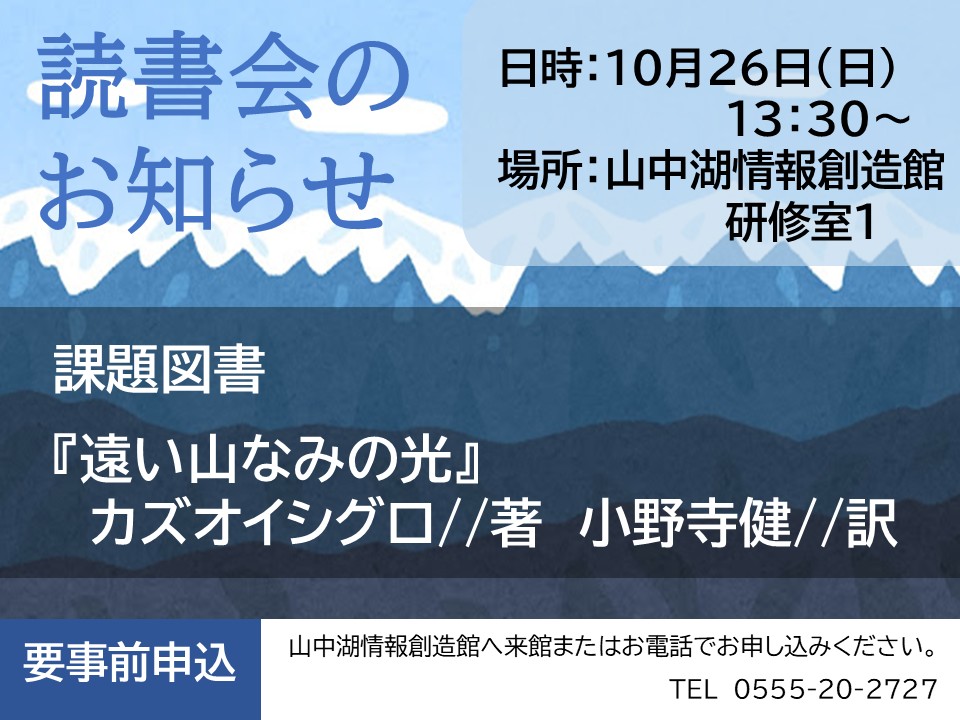 10月の読書会 2025年10月3日 イベント情報 日時 10月26日(日) 13:30~15:00場所 山中湖情報創造館 研修室1 課題図書は…『遠い山なみの光』(カズオイシグロ/著 小野寺健/訳) 【要事前申し込み】となっています。参加希望の方は、山中湖情報創造館へ来館またはお電話でお申し込みください。 Share: Older Post すすめ!カリンバ隊(10月) Newer Post クラフトマーケットのお知らせ