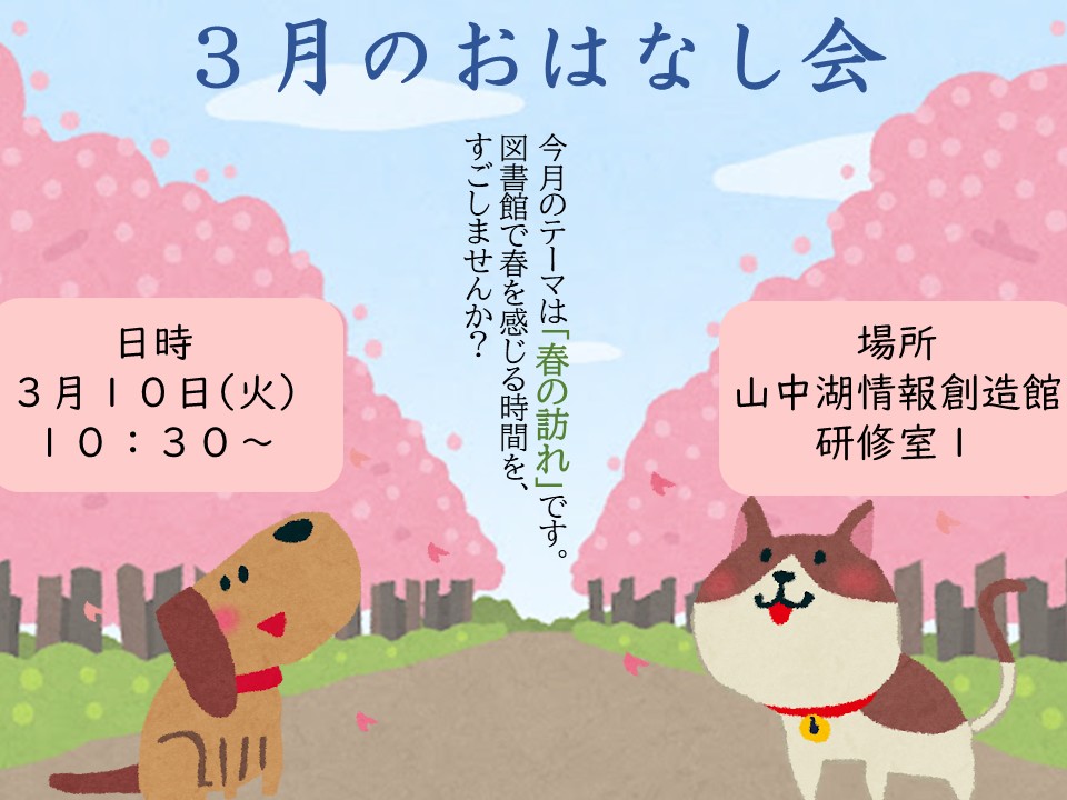 3月のおはなし会 2026年3月2日 イベント情報 日時 3月10日(火) 10:30 ~ 11:00場所 山中湖情報創造館 研修室1 3月のテーマは「春の訪れ」です。図書館で春を感じる時間をすごしませんか? たくさんのご参加お待ちしています! Share: Older Post DVD上映会第3弾のお知らせ Newer Post すすめ!カリンバ隊(3月)