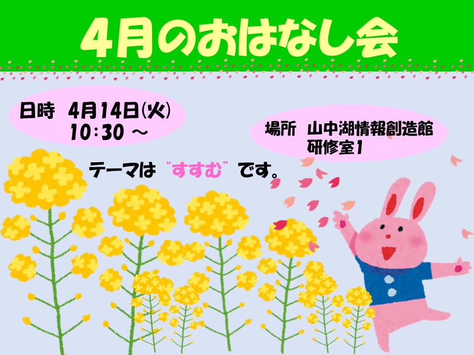 4月のおはなし会 2026年3月19日 イベント情報 日時 4月14日(火) 10:30 ~ 11:00場所 山中湖情報創造館 研修室1 4月のテーマは“すすむ”です。歩くのも走るのも大事な一歩。楽しい絵本の世界に足を一歩踏み入れてみませんか? 初めての方でも安心してご参加いただけます。当日のご来場お待ちしております! Share: Older Post 旅行情報誌コーナーのご案内
