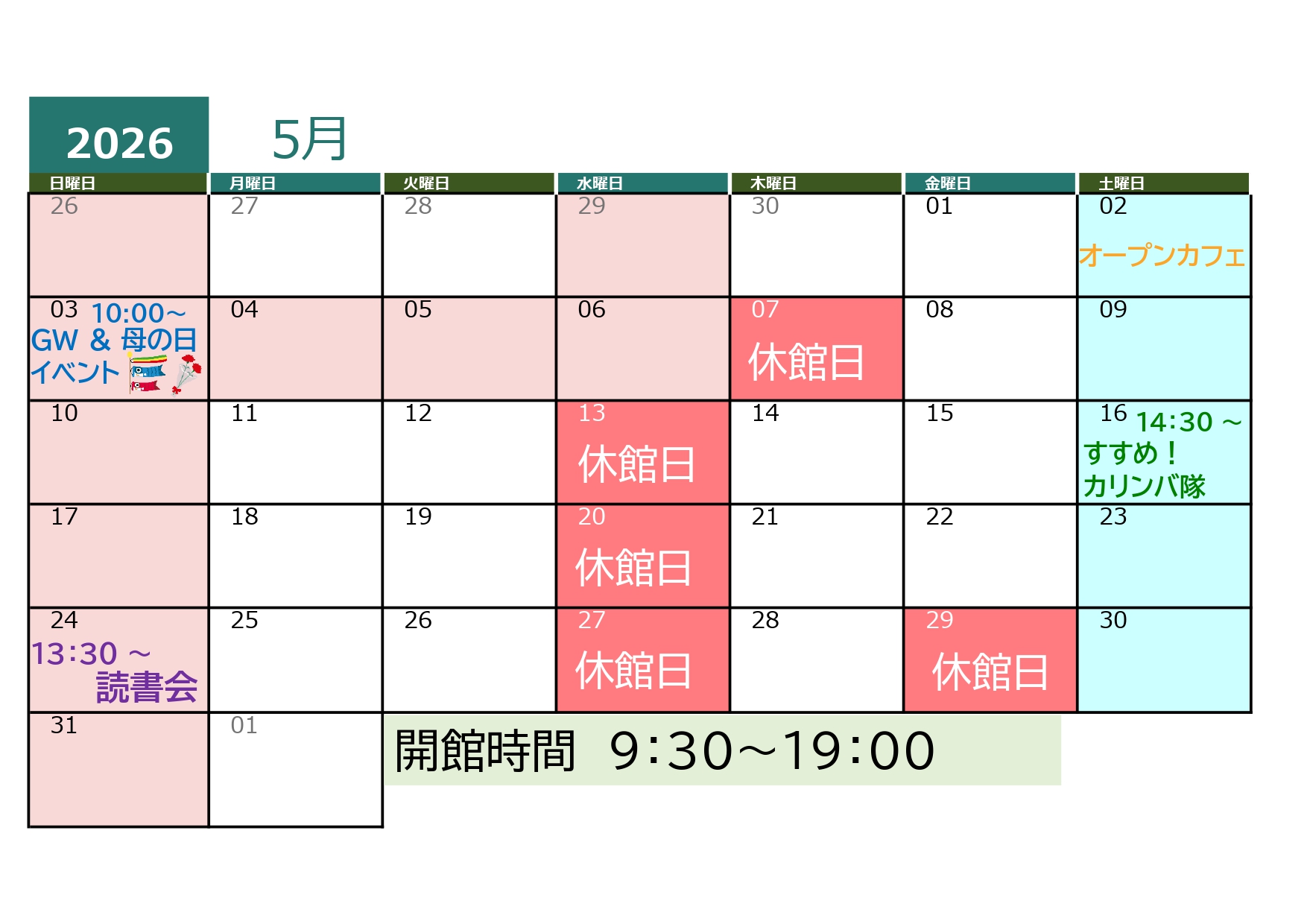 5月の月末休館日は5月29日です。