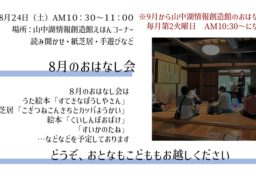 8月のおはなし会は8月24日(土)に実施されます。絵本の読み聞か…