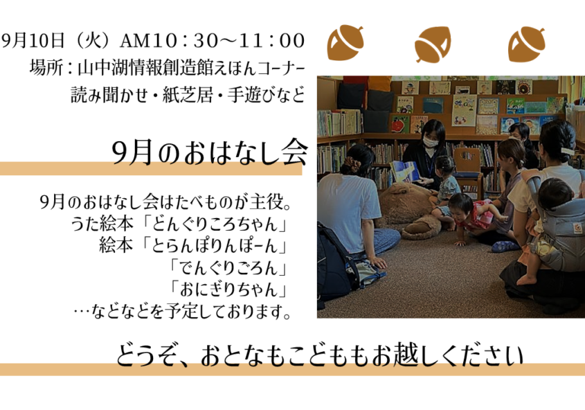 ※おはなし会の開催曜日は毎月第2火曜日になりました。 9月のおは…